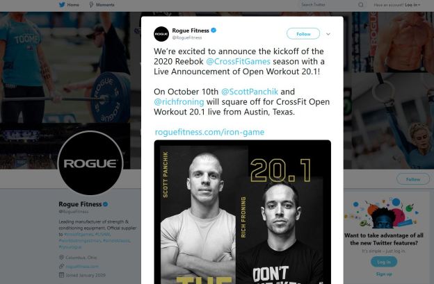 Pic courtesy of Rogue Fitness’ Twitter page. Tune in to the live stream of the 20.1 announcement. Click on the above pic to go to the Rogue site.