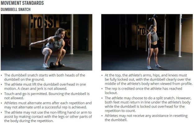 Prior to starting this workout, the athlete will need to mark a long, straight line on the floor and place the box on the center of that line.This workout begins with the dumbbell resting on the floor and the athlete standing tall. After the call of “3, 2, 1… go!” the athlete will begin the dumbbell snatches, alternating arms after each repetition. Once 10 reps are complete, they will move to the box and perform 15 burpee box jump-overs. Following this sequence, the number of snatch repetitions will increase each round while the burpee box jump-overs will remain the same. This workout ends when the athlete’s feet land on the ground on the other side of the box after the final rep.The athlete’s score will be the total time it takes to complete the workout or the total number of repetitions completed before the 20-minute time cap.