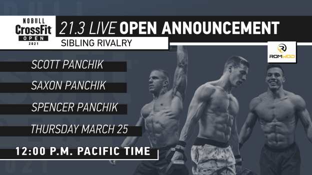 Pic courtesy of The CrossFit Games. Open Workout 21.3 will be announced live on Thursday, March 25, at 12 p.m. local time. Don’t miss the sibling showdown as Scott, Saxon, and Spencer Panchik take on the workout as soon as it’s announced at the CrossFit Home Office in Scotts Valley, California.